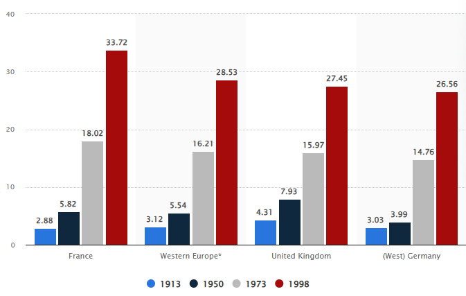 - Fuente: https://www.statista.com/statistics/1072844/labor-productivity-western-europe-1913-1998/#:~:text=Overall%2C%20Western%20Europe’s%20productivity%20per,to%2028.53%20dollars%20in%201998. ↩︎