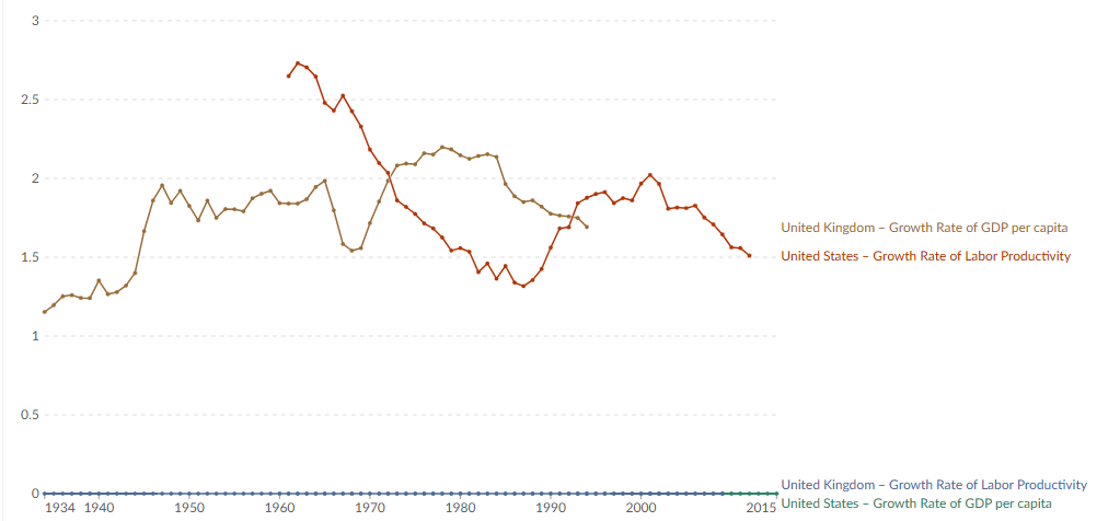 Según los datos de Growth rate of productivity 1934-2015 de Our World in Data12, se puede observar un rápido crecimiento en la productividad durante los años 70-90 después de la recuperación tras la guerra, que posteriormente experimenta un descenso del crecimiento hasta nuestros días13. Por ende, los famosos «milagros económicos» que se dieron en muchos países a lo largo de la segunda mitad del siglo XX, como fue el caso de EEUU, Japón o España, resulta que nunca fueron milagros, sino los avances en las mismas fuerzas productivas que hoy se han topado con nuevas limitaciones técnicas a superar.
